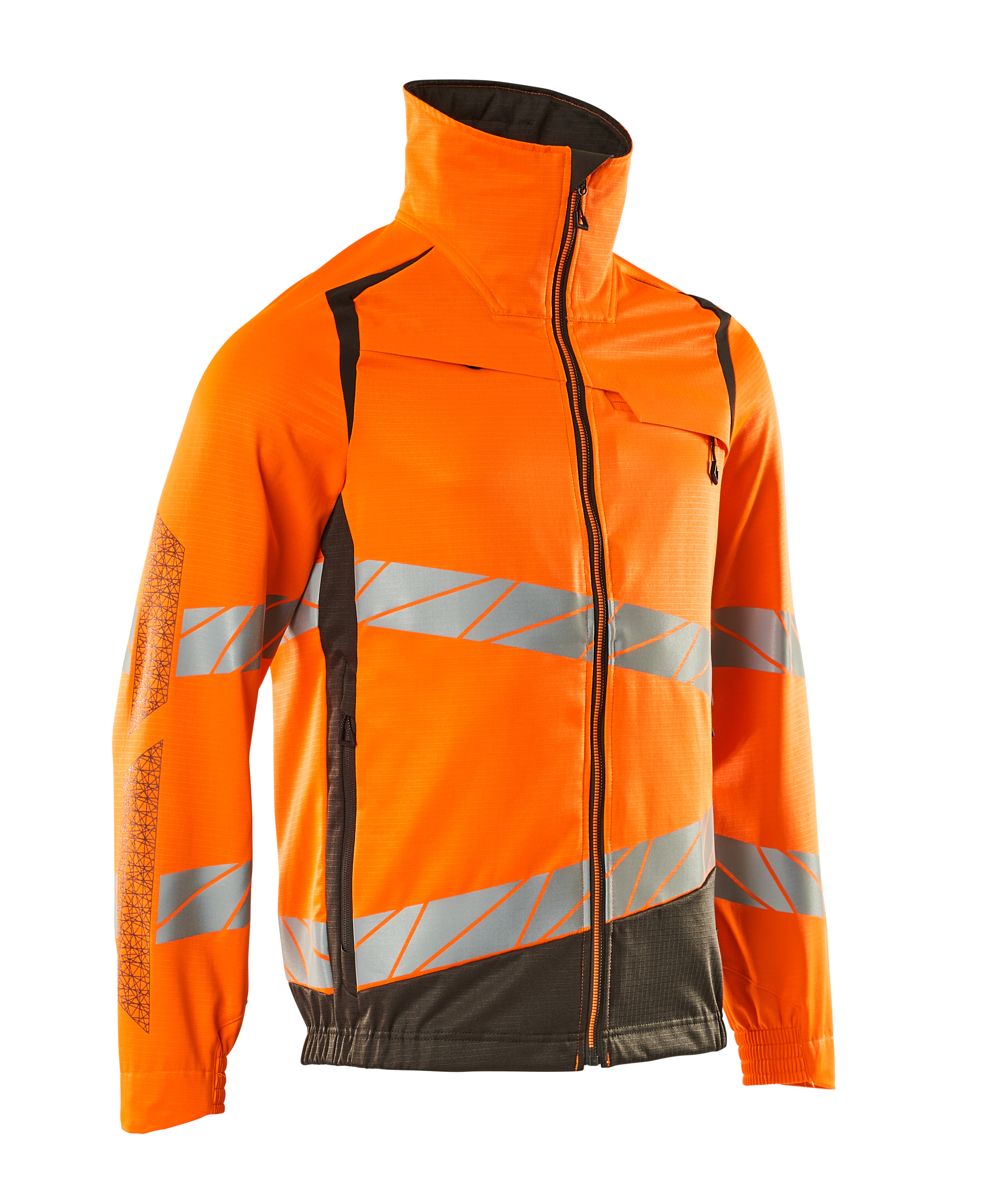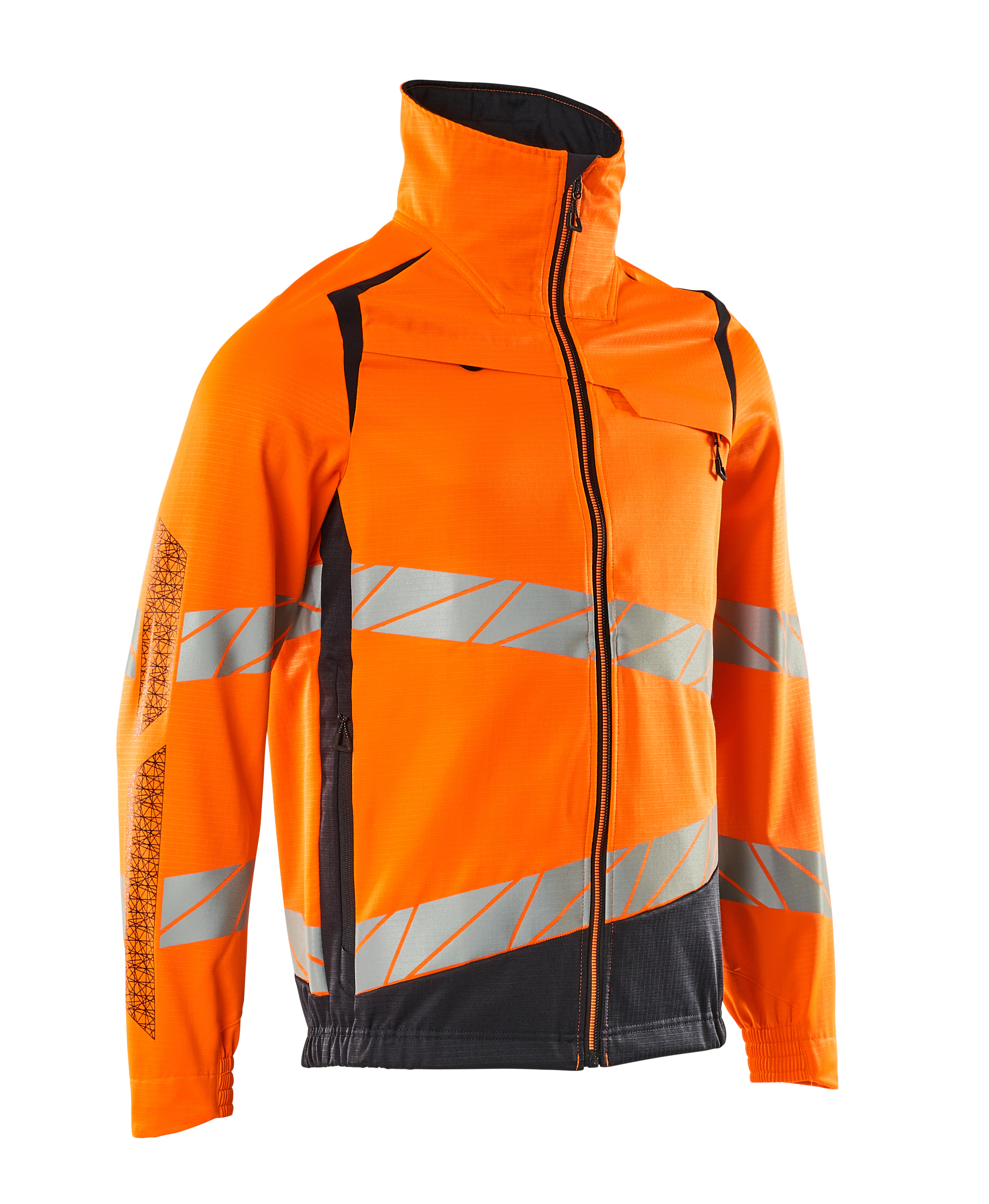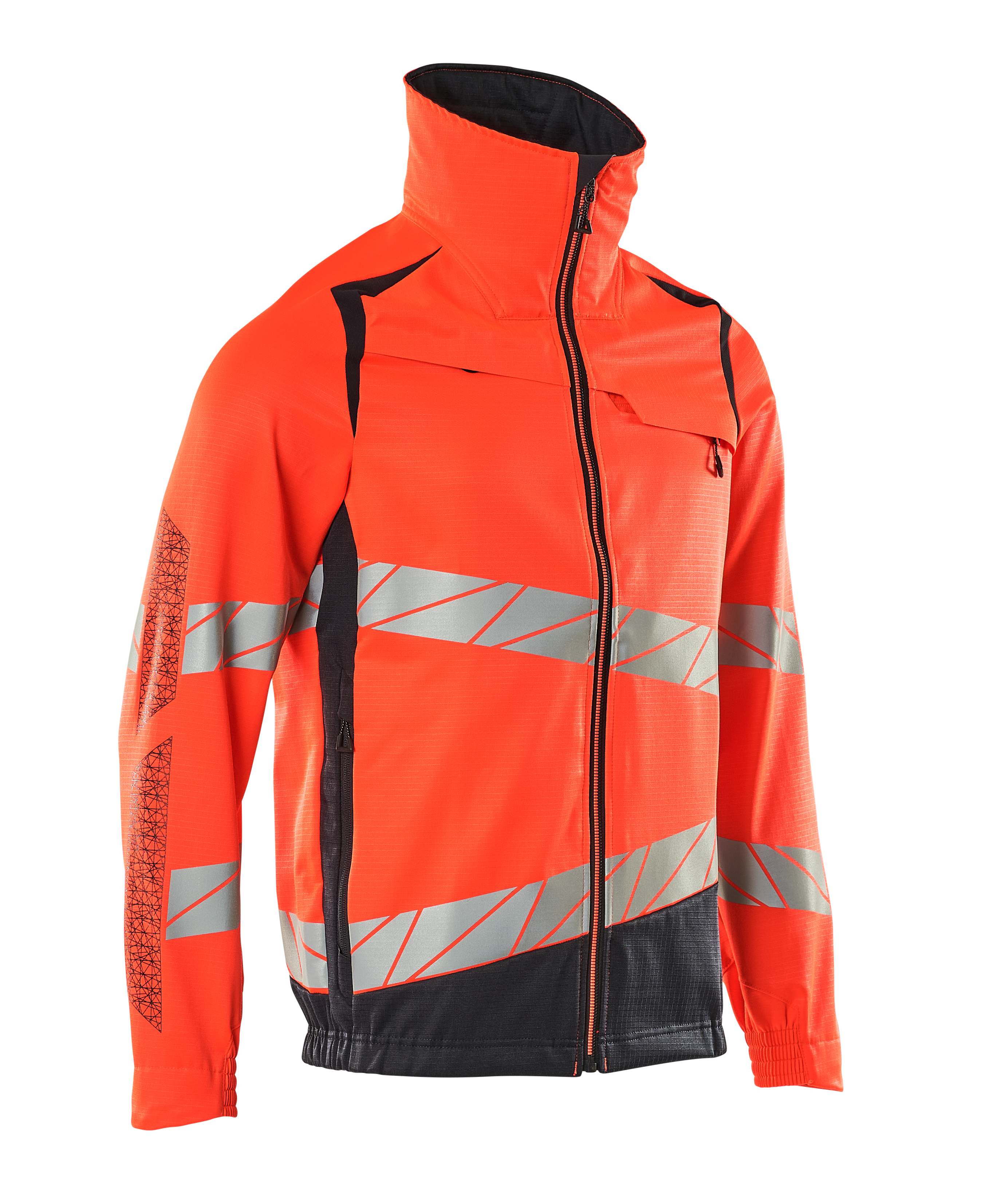Fluorescerend, met schuine reflectie. Bepaalde delen van het product zijn voorzien van stretchmateriaal. Combinatie van de lichtgewicht stofkwaliteit 236 en ULTIMATE STRETCH kwaliteit 511. Tweekleurig. Hoge kraag. Sluiting met rits en inwendige windvanger. D-ring. Borstzak met rits. Voorzakken met rits. Binnenzakken. Elastiek in de zijden aan de onderkant. Elastiek bij de pols. Met prints. Certificering: Oeko-Tex® Standard 100; EN ISO 20471 - kl. 2; Hi-Vis groep A; ProWash®