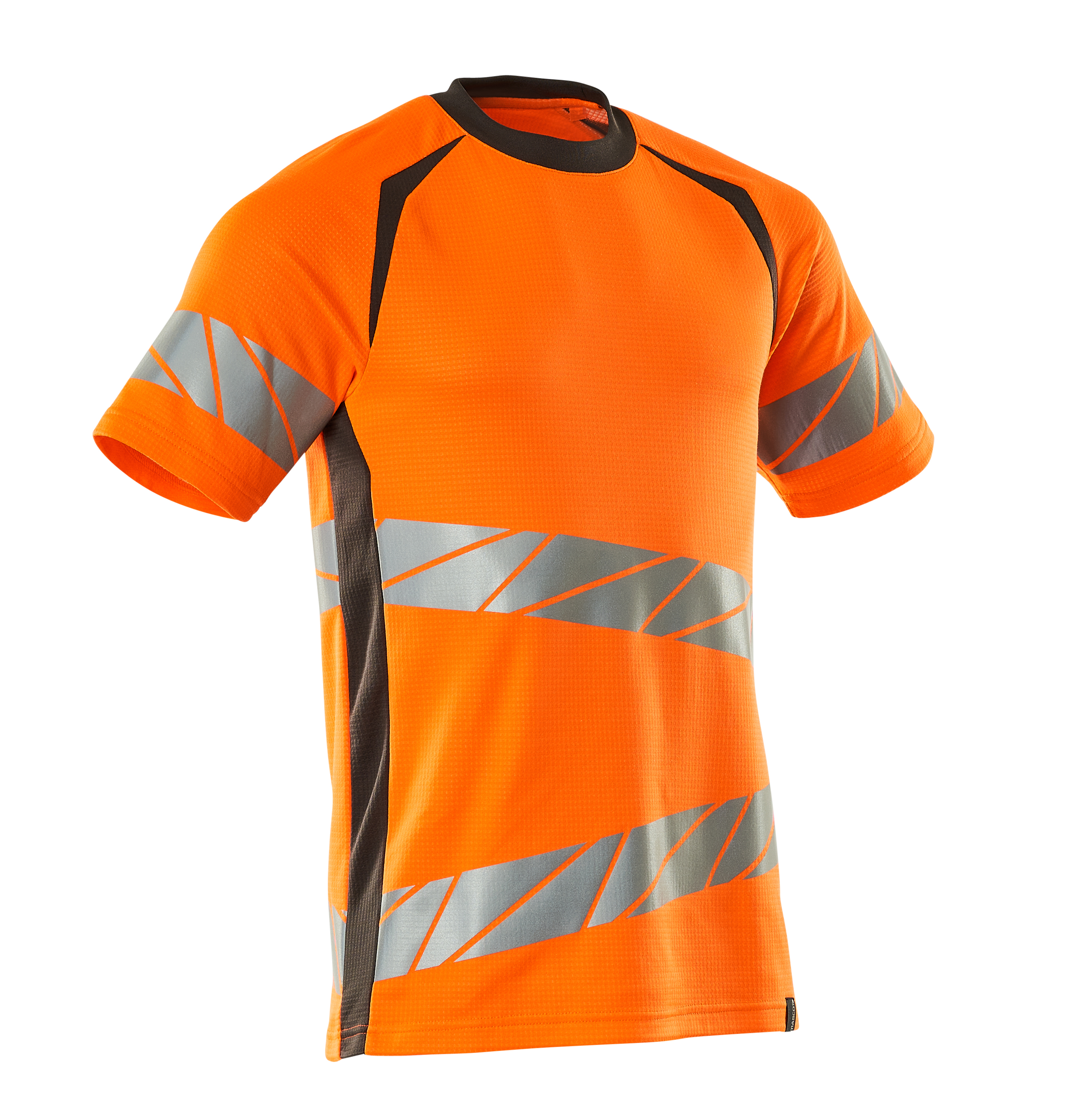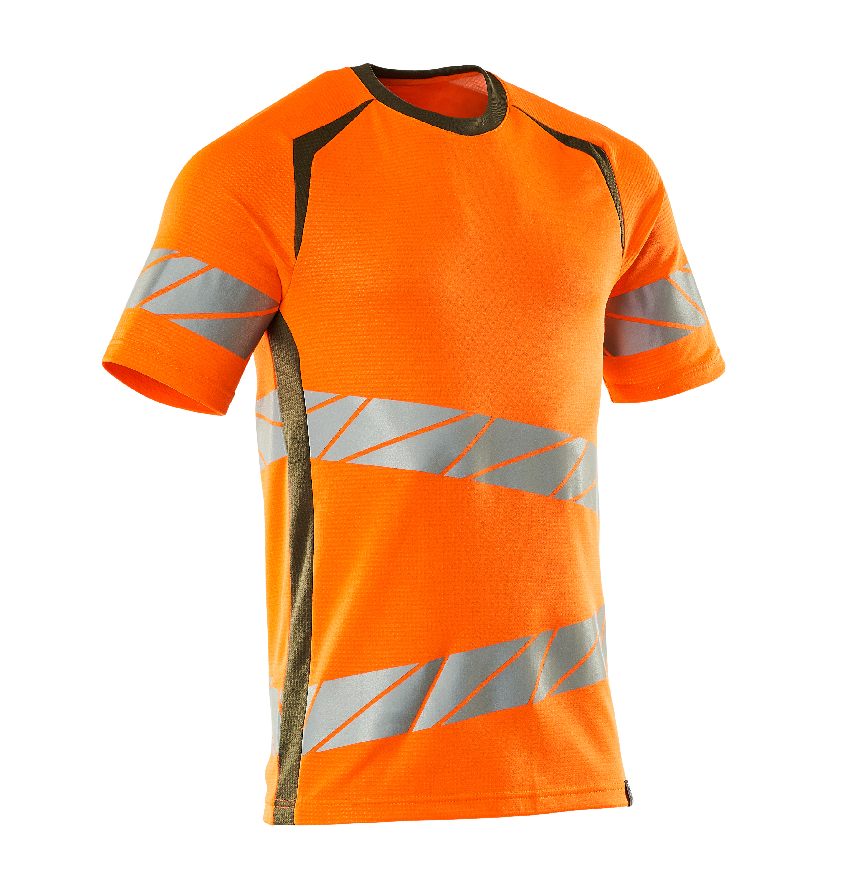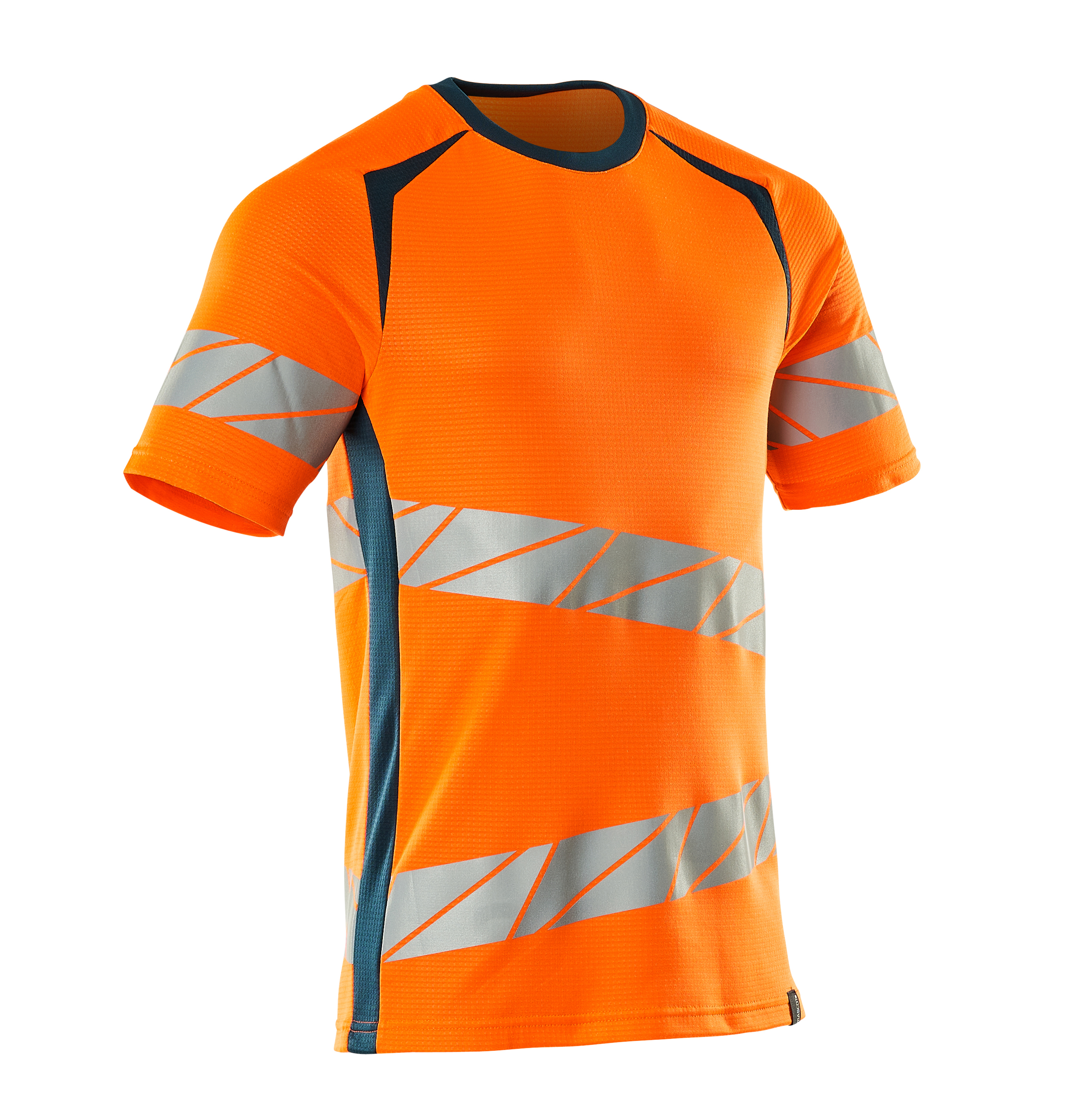 Premium. Fluorescerend, met schuine reflectie. Tweekleurig. Moderne pasvorm. Comfortabel katoen aan de binnenkant en duurzaam polyester met stretch aan de buitenkant. Vierkant jacquardpatroon. Elastische reflectieband. Ronde hals. Tricot aan de hals. Verstevigde boord. Certificering: Oeko-Tex® Standard 100; EN ISO 20471 - kl. 2; Hi-Vis groep B; EN 13758-2 UPF 40+