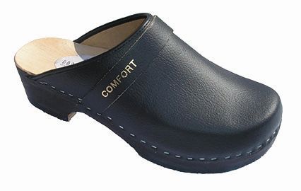 Bovendeel leer, open hiel, houten zool.