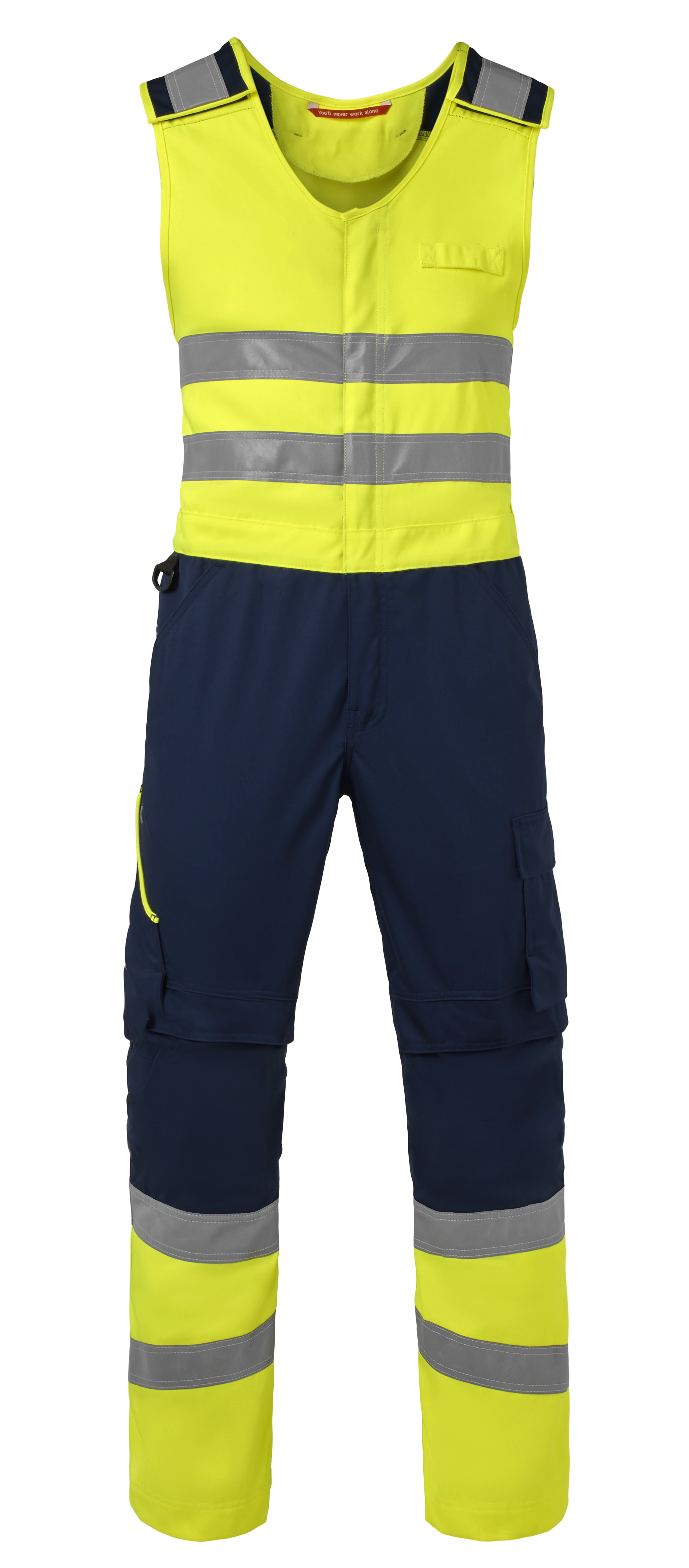 Bodybroek uit de HAVEP® High Visibility+ collectie. Deze broek is gemaakt van katoen en polyester. Verdekte ritssluiting, 2 ingezette zijzakken, 2 intasten met drukknoop, 1 ingezette achterzak met klep, loshangende duimstokzak, loshangende dijbeenzak, makkelijk toegankelijke kniezakken met opening aan bovenzijde afsluitbaar met klep en klittenband, voorgevormde broekspijpen voor zeer goede pasvorm, drievoudig gestikte naden op kwetsbare plekken voor een extra lange levensduur, verstelbare schouderbanden met klittenband, extra inzet bij kruis ter voorkoming van uitscheuring, reflectieband Certificering: EN ISO 20471, Klasse 2