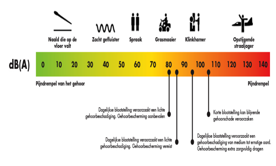 De grenswaarde (wettelijke norm) is 80 dB(A) bij een blootstelling van 8 uur per dag. Op dit niveau dient de werkgever gehoor beschermende middelen ter beschikking te stellen. Vanaf 85 dB(A) is het geluid “schadelijk” en dient de werkgever technische-organisatorische maatregelen te treffen, zoals werkplekken aan de hand van pictogrammen duidelijk te maken dat gehoorbescherming verplicht is. Let wel, lawaaibelasting is niet alleen schadelijk voor het gehoor. Daarnaast zijn vele vormen van lichamelijke stoornissen (bijv. concentratieproblemen, maag- en darmklachten en hoge bloeddruk) door een te hoge lawaaibelasting mogelijk.